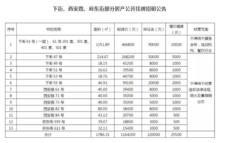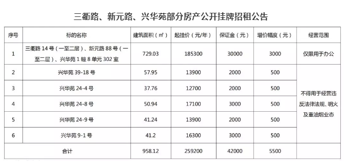 2.以上標(biāo)的租賃期限均為5年,上述標(biāo)的首年租金按成交價,從第二年起在上年租金基礎(chǔ)上遞增3%。