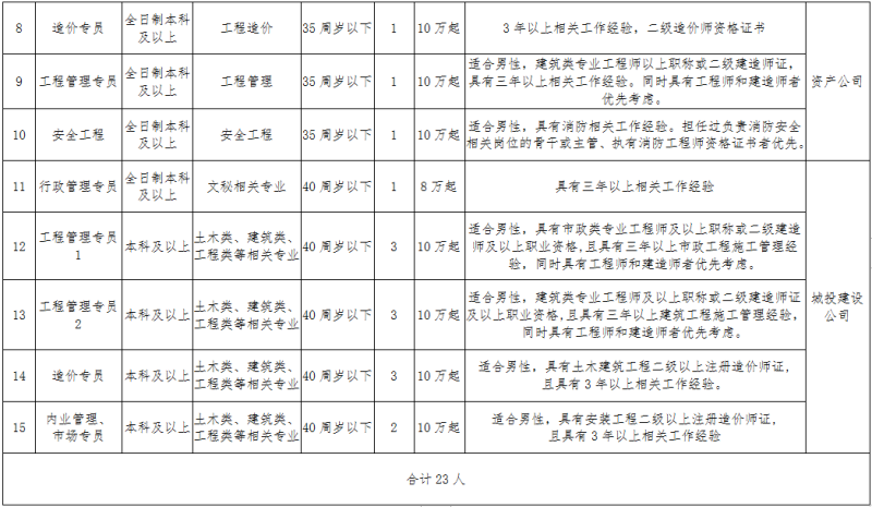一、招聘原則堅(jiān)持“公開、公平、公正、擇優(yōu)”的原則。二、招聘計(jì)劃本次面向社會(huì)公開招聘衢州市城市建設(shè)投資集團(tuán)有限公司及下屬子公司國(guó)有企業(yè)工作人員共23人。具體招聘崗位、崗位(專業(yè))人數(shù)及其他條件要求詳見附表1。三、招聘條件報(bào)名者除應(yīng)符合所選聘職位的具體要求外,還應(yīng)具備以下基本條件:1.擁護(hù)中華人民共和國(guó)憲法,具有良好的思想政治素質(zhì)和保密意識(shí)。2.熱愛工作,遵紀(jì)守法,誠(chéng)實(shí)守信、品行端正。3.有事業(yè)心和責(zé)任感,良好的學(xué)習(xí)能力、分析能力。4.具有勝任應(yīng)聘崗位需要的相關(guān)專業(yè)知識(shí)和工作能力,符合應(yīng)聘崗位要求的其它具體資格和條件,其中35周歲以下指1984年10月1日以后出生,其他年齡依此類推。5.身體健康,適應(yīng)崗位要求的身體條件。6.曾因犯罪受過刑事處罰的人員,曾被開除公職的人員,在公務(wù)員招考(事業(yè)單位招聘)考試中被認(rèn)定實(shí)施了考試作弊、弄虛作假行為且仍在不得報(bào)考期限內(nèi)的人員,以及具有法律規(guī)定不得錄用為公務(wù)員的其他情形的人員,不得報(bào)考。7.應(yīng)聘人員不得報(bào)考與招聘單位有公務(wù)員法第六十八條所列回避情形的崗位。8.本次招聘所涉及的工作經(jīng)驗(yàn)計(jì)算統(tǒng)一截止到2020年10月1日。在校就讀期間參加社會(huì)實(shí)踐、實(shí)習(xí)、兼職等不能計(jì)算為工作經(jīng)歷。9.全日制碩士研究生及以上學(xué)歷應(yīng)聘人員報(bào)考崗位專業(yè)不限,可適當(dāng)放寬條件。四、招聘程序和錄用辦法按照公開報(bào)名、資格審查、筆試、面試、體檢和考察、公示、聘用程序進(jìn)行招聘。(一)報(bào)名1.報(bào)名方式:現(xiàn)場(chǎng)報(bào)名。2.報(bào)名時(shí)間:2020年10月21日—2020年11月3日(節(jié)假日除外,上午8:30-12:00,下午14:00-17:00)。3.報(bào)名地點(diǎn):衢州市柯城區(qū)世紀(jì)大道711號(hào)(衢州市人力資源服務(wù)產(chǎn)業(yè)園一樓)。4.聯(lián)系方式:0570-3851819(程女士)、0570-3851069(徐女士)。5.注意事項(xiàng):應(yīng)聘人員請(qǐng)佩戴口罩前往報(bào)名處,每人限報(bào)1個(gè)崗位,多報(bào)無效。應(yīng)聘人員必須對(duì)提交材料的真實(shí)性負(fù)責(zé),凡弄虛作假者,一經(jīng)查實(shí),即取消考試資格或聘用資格。應(yīng)聘人員需攜帶本人有效身份證件、學(xué)歷(學(xué)位)證書(附學(xué)信網(wǎng)上的教育部學(xué)歷證書電子注冊(cè)備案表,留學(xué)人員應(yīng)提供教育部留學(xué)服務(wù)中心出具的國(guó)外學(xué)歷學(xué)位認(rèn)證書)、工作證明(附社保單位公章的歷年社保繳費(fèi)證明)、報(bào)考崗位所需的職稱證書、職業(yè)資格證書及其它相關(guān)證書原件及復(fù)印件,近期免冠1寸彩色照片1張,到現(xiàn)場(chǎng)報(bào)名統(tǒng)一填寫《報(bào)名登記表》。(二)資格審查報(bào)名時(shí)間截止后,由海納公司根據(jù)應(yīng)聘人員提供的資料進(jìn)行資格審查,城投集團(tuán)審核。(三)考試1.本次招聘原則上按照招聘計(jì)劃數(shù)與資格審查合格人數(shù)1:3比例開考,不足開考比例的按招聘計(jì)劃數(shù)3倍的崗位將酌情核減,核減情況通過相關(guān)平臺(tái)面向社會(huì)公布,不做補(bǔ)充報(bào)名工作。2.筆試:由海納公司統(tǒng)一組織筆試,采用閉卷形式,滿分為100分。重點(diǎn)考察專業(yè)理論知識(shí)掌握能力、文化素養(yǎng)、知識(shí)儲(chǔ)備和業(yè)務(wù)基礎(chǔ),不指定復(fù)習(xí)范圍。3.面試:根據(jù)筆試成績(jī),每個(gè)崗位按照招聘崗位計(jì)劃數(shù)按筆試成績(jī)從高分1:4的比例從高分到低分確定面試對(duì)象。應(yīng)聘者未在規(guī)定時(shí)間內(nèi)參與面試的,視同自愿放棄面試資格,即不予遞補(bǔ),不足比例的按照實(shí)際入圍人數(shù)確定。面試采用結(jié)構(gòu)化面試方式,滿分為100分,合格分為60分(低于60分為不合格),面試不合格者不予聘用。4. 因疫情原因,具體筆試、面試時(shí)間、地點(diǎn)另行通知。(四)體檢1.面試結(jié)束后,按筆試成績(jī)占30%、面試成績(jī)占70%的比例折合總成績(jī),保留小數(shù)點(diǎn)后兩位。2.根據(jù)總成績(jī)從高分到低分按1:1確定體檢對(duì)象,總成績(jī)相同者,以筆試成績(jī)高者確定體檢對(duì)象。3.應(yīng)聘人員不按規(guī)定時(shí)間、地點(diǎn)參加體檢,視作放棄體檢,取消考察和聘用資格;若有放棄體檢或體檢不合格的,則按總成績(jī)從高到低依次遞補(bǔ)。4.體檢由城投集團(tuán)組織,因疫情原因,時(shí)間、地點(diǎn)另行通知。(五)考察考察工作參照考錄公務(wù)員考察標(biāo)準(zhǔn)執(zhí)行。側(cè)重于考察思想政治表現(xiàn)、道德品質(zhì)、核查檔案資料,是否有不良記錄等情況,并對(duì)應(yīng)聘人員資格條件進(jìn)行復(fù)查(學(xué)歷的認(rèn)證以中國(guó)高等教育學(xué)生信息網(wǎng)的信息為準(zhǔn))。考察結(jié)論為不宜聘用的或在考察階段本人自動(dòng)放棄聘用資格的,在面試合格人員中按總成績(jī)從高分到低分依次遞補(bǔ)。(六)公示聘用經(jīng)考試、體檢和考察情況擇優(yōu)確定擬聘人員,公示5個(gè)工作日無異議后,按規(guī)定程