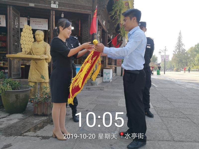 今天上午,水亭門(mén)邵永豐商鋪店長(zhǎng)手持一面印有“情系商戶(hù),真情服務(wù)”金色大字的錦旗送到保安隊(duì)長(zhǎng)周?chē)?guó)洲手上,由衷感謝街區(qū)保安隊(duì)給予的優(yōu)質(zhì)服務(wù)。