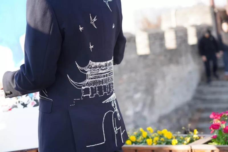 視頻中,何平身著有天王塔元素的西服,并置身在天王塔下邊觀摩婺劇表演者的表演,邊用畫筆一筆一畫畫出婺劇演員最精髓的表情和動(dòng)作,并和澳門的景色結(jié)合在一起,別有一番韻味。