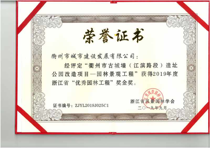 近日,由城發(fā)公司作為業(yè)主實施的衢州市古城墻(江濱路段)遺址公園改造項目-園林景觀工程榮獲2019年度浙江省“優(yōu)秀園林工程”獎金獎。