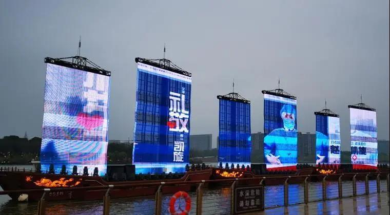 在水亭門歷史文化街區(qū)的公屏上,滾動播放著衢州馳援湖北的白衣戰(zhàn)士的抗疫視頻和海報。