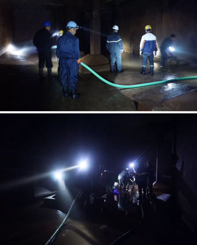 隨后,水廠又分八次對剩余的反應沉淀池、清水池及泵房集水井進行進行清洗及檢查維護。隨著洗池持續(xù)進行,員工的體力消耗力較大,后階段的清洗工作越來越艱巨。特別是在清水池清洗過程中,排水泵的鋼絲軟管約有30多米,每次搬動都需要十多人配合;為保證供水安全,每次清水池切換及降液位,都需要領(lǐng)導帶隊,三個閥門操作小組和中控值班員密切配合,掐著時間和液位,對水泵機組和閥門進行切換操作;另外三千四百多平方米的地下清水池,廊道迂回曲折,幽濕黑暗,且無手機信號,所以洗池時,幾乎絕大部分員工都要“失聯(lián)”七八個小時。