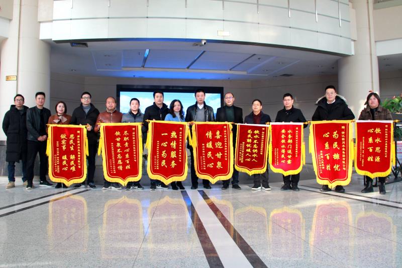 12月21日上午,衢江區(qū)水利局局長楊偉華,廿里鎮(zhèn)黨委副書記、鎮(zhèn)長劉俊峰,全旺鎮(zhèn)黨委副書記、鎮(zhèn)長余豪驥,后溪鎮(zhèn)黨委副書記鎮(zhèn)長林華,峽川鎮(zhèn)鎮(zhèn)長朱志峰及各鄉(xiāng)鎮(zhèn)農(nóng)民飲用水工程分管領(lǐng)導(dǎo)、村干部代表一行來到市水業(yè)集團(tuán)并送上了8面錦旗。
