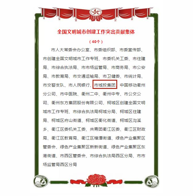 其中,市城投集團(tuán)獲全國(guó)文明城市創(chuàng)建工作突出貢獻(xiàn)集體,葉國(guó)勝、繆明獲全國(guó)文明城市創(chuàng)建工作突出貢獻(xiàn)個(gè)人。